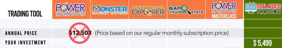 You can save more when you purchase a one-year subscription to Total Access Trading. Not only will you receive access to those four great tools for a 12-month period, you will receive access to the Power Option Plays Masterclass for the duration of your subscription.